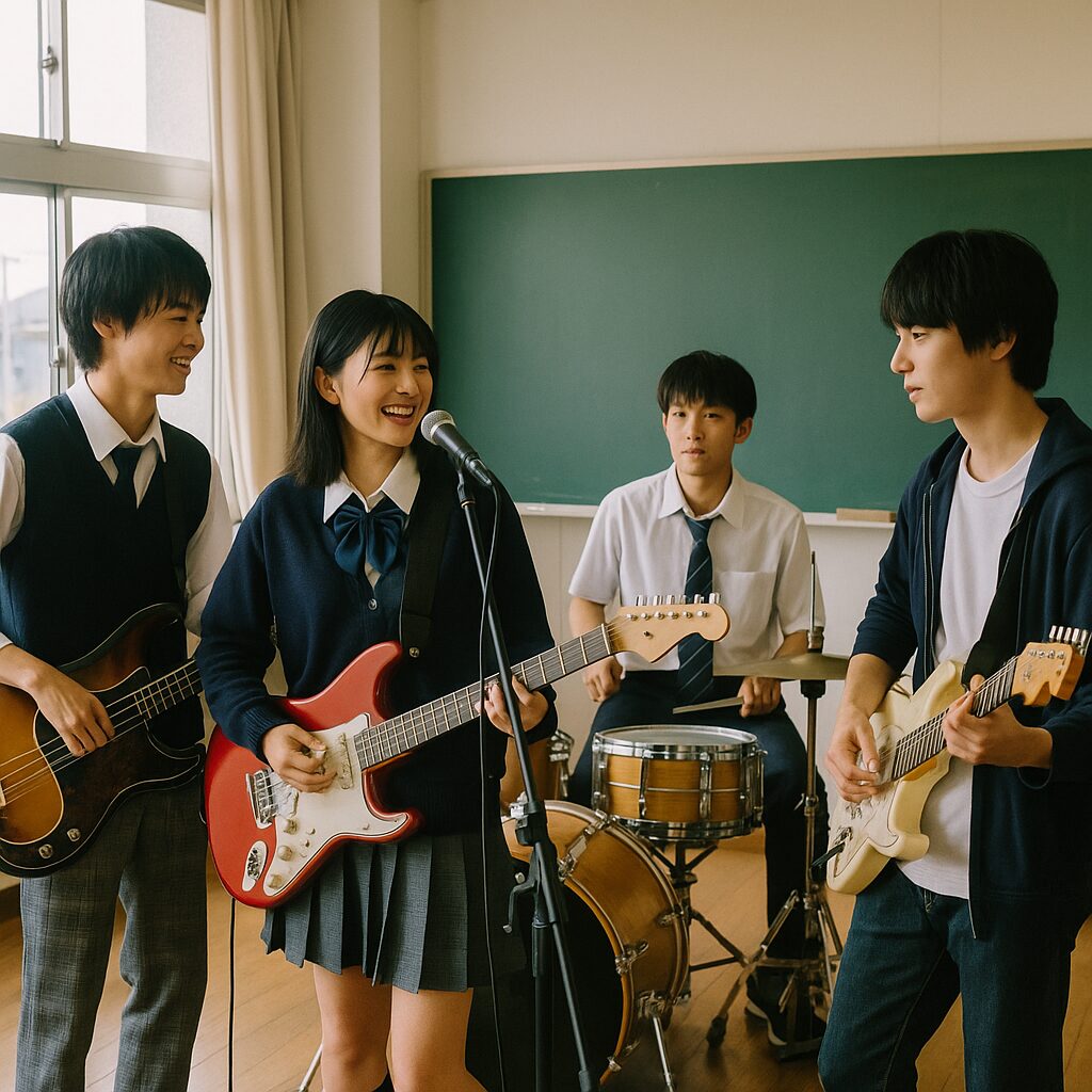 星音高校軽音部は、「音でつながる、音で魅せる」をモットーに、日々の練習とライブ活動に励んでいます。